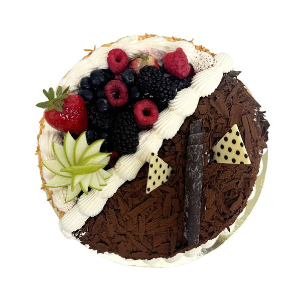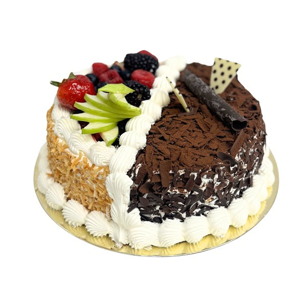 Freshly made 8" Half & Half Cake with one side rich chocolate and the other topped with fresh mixed fruits — a perfect balance of indulgence and freshness.