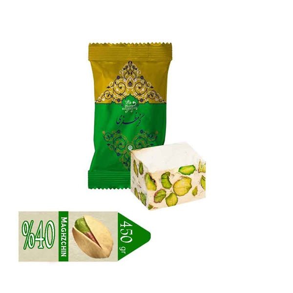 Mozaffari Gaz 40% (450g) is a premium Persian nougat infused with 40% pistachios, offering a rich and chewy texture. Made with natural ingredients, it delivers a delicate sweetness and nutty crunch, perfect for tea time or as a gift.