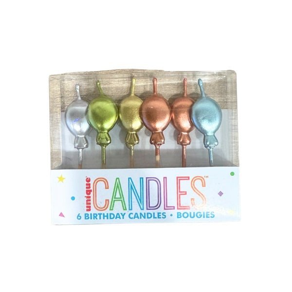Fun and festive, these metallic balloon candles bring a pop of color and shine to any birthday cake. Pack includes 6 shaped candles.