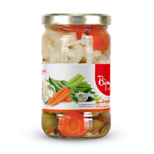 Bijan Salted Mixed Vegetables (670g) is a jar of assorted pickled vegetables, including ingredients like carrots, cauliflower, and cucumbers, all seasoned with salt for a tangy and savory flavor. Perfect as a side dish or appetizer.